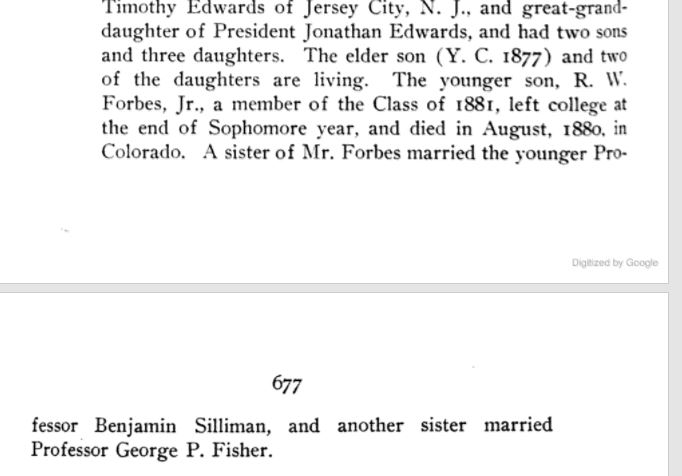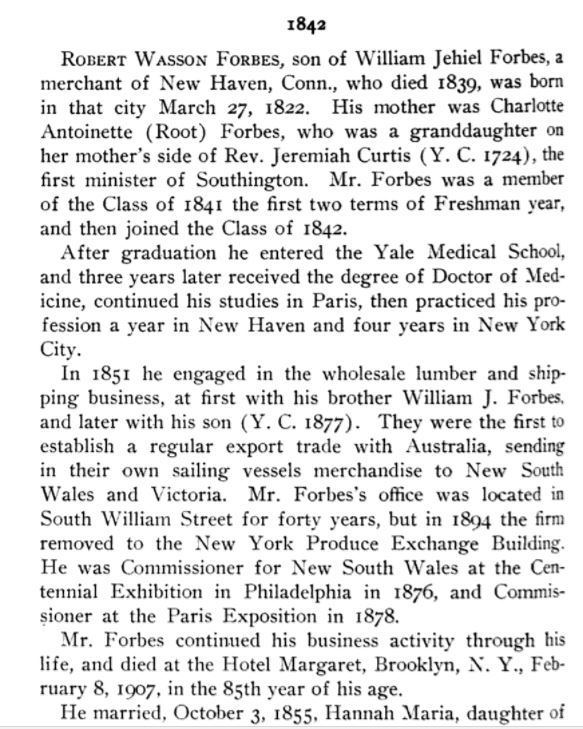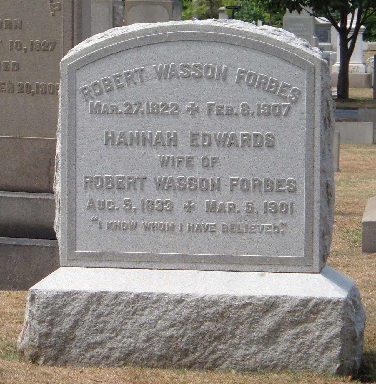 - [S5349] Find A Grave: Grove Street Cemetery, New Haven, Connecticut, Robert Wasson Forbes, created by Jan Franco, added Nov 2005, memorial number 12241451.