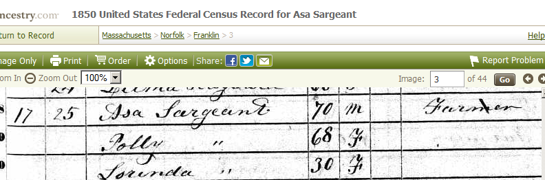 - [S3344] 1850 US Federal Census, Franklin, Norfolk County, Massachusetts, digital image Ancestry, National Archives micropublication, Asa Sargent head of household, roll M432_331, page 291A .