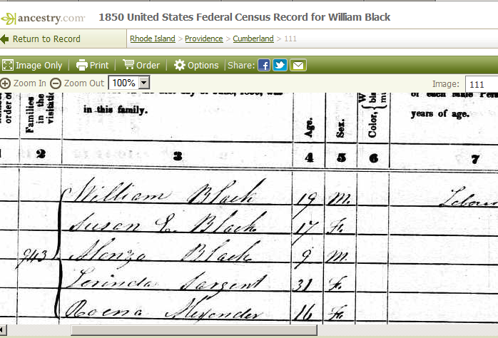 - [S1286] 1850 US Federal Census, Cumberland, Providence County, Rhode Island, digital image Ancestry, National Archives micropublication, George Black head of household, roll M432_843, page 156A .