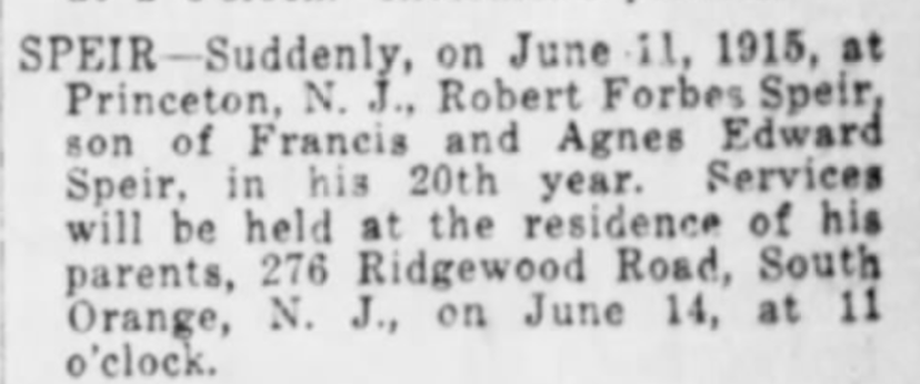 - [S5641] Find A Grave: Rosedale Cemetery, Rosedale, New Jersey, Robert Forbes Speir, created by NotYourTime, added Nov 2017, memorial number 184848399.