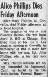 - [S8585] Corvallis Gazette-Times, Corvallis OR, Newspaper, Alice Phillips obituary notice, published 3 Jul 1965 p 14.