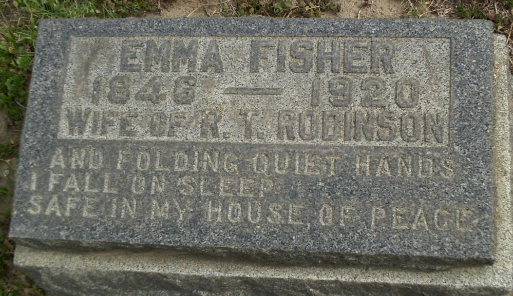 Abstract: Died Feb 28, 1920 at the home of her daughter, Mrs. F. A. Pagel, 1349 Walnut Avenue. Age 73. Survived by another daughter Mrs. J. H. Olmstead of Homer, N.Y.; five sons, Richard F. of Alsea, Ore., Harry A. Spencer of S. D., John F. of Boston, Mass., Gilbert O. of New Orleans, LA., and Lawrence W. of Parker, S.D.; and twenty-three grandchildren. She was a native of Walden, Mass. and came to California from South Dakota in 1911 where she made her home in Long Beach. She was a pioneer in South Dakota, and her husband, R. T. Robinson, Civil war veteran, died in that state fifteen years ago.8