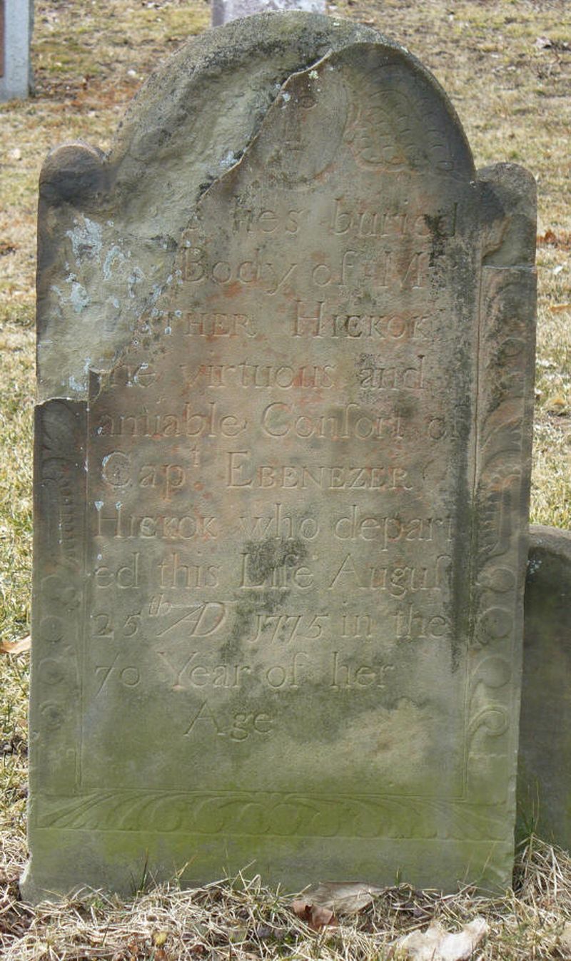 - She was buried in Congregational Church Cemetery, Bethel, Connecticut. Inscription: Here lies buried the body of Mrs. Esther Hickok the virtuous and amiable consort of Capt. Ebenezer Hickok who departed this Life August 25th AD 1775 in the 70 Year of her Age.3