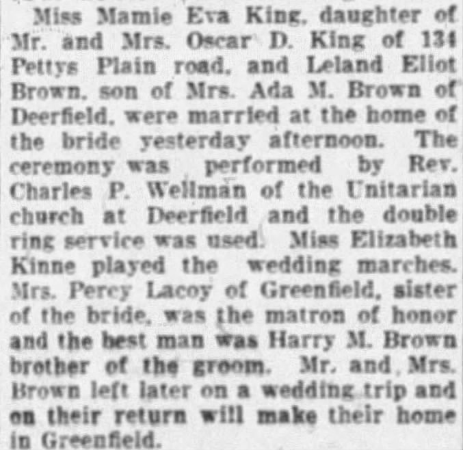 - Mary married Leland Elliot Brown, son of Augustus Brown and Ada Maria Mason, on 1 September 1925 in Greenfield, Massachusetts.1,2
