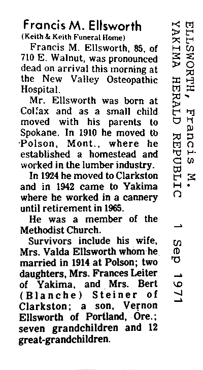 - [S1775] 1930 US Federal Census, Clarkston, Asotin County, Washington, digital image Ancestry, National Archives micropublication, Francis Ellsworth head of household, roll 2484, enumeration district 5, page 26A .