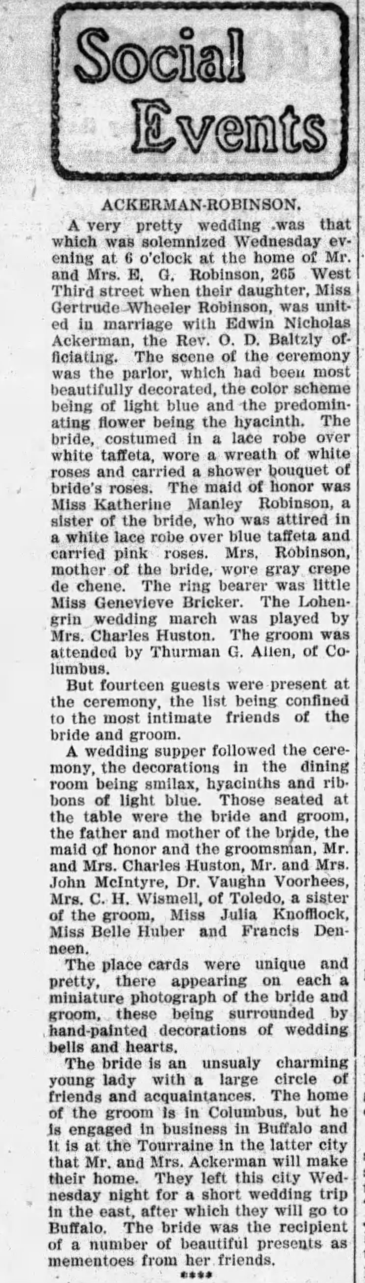 - Gertrude married Edwin Nicholas Ackerman on 7 March 1906 in Mansfield, Ohio.2