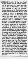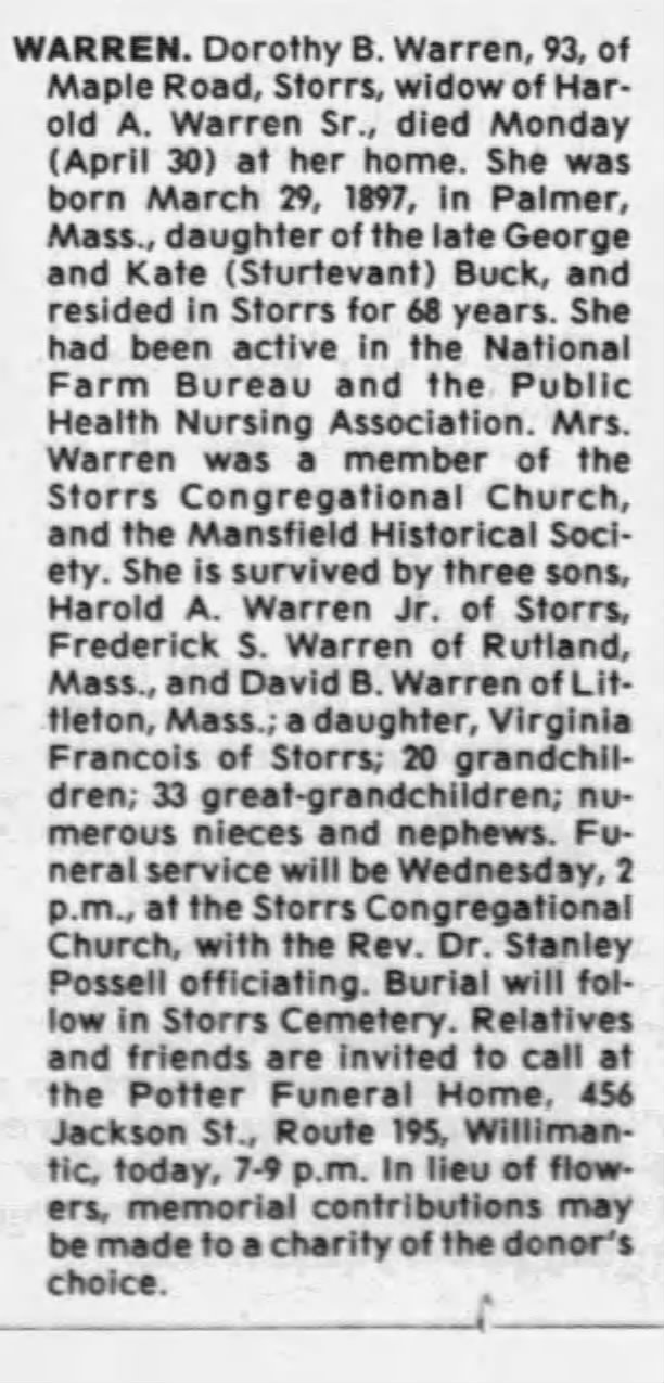 - [S4106] Hartford Courant, Hartford, CT, Newspaper, Dorothy B Warren, obituary notice, published 1 May 1990 in the Hartford Courant, p 36.