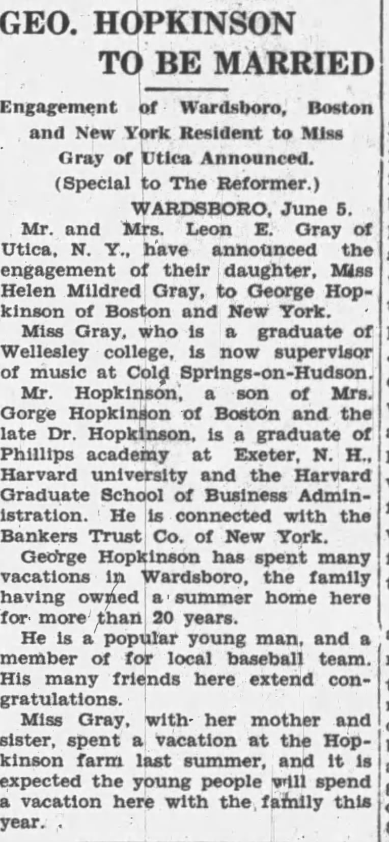- [S8114] The Brattleboro Reformer, Brattleboro Vermont, Newspaper, Hopkinson_Gray engagement announcement, published Jun 5 1935 ; 1.