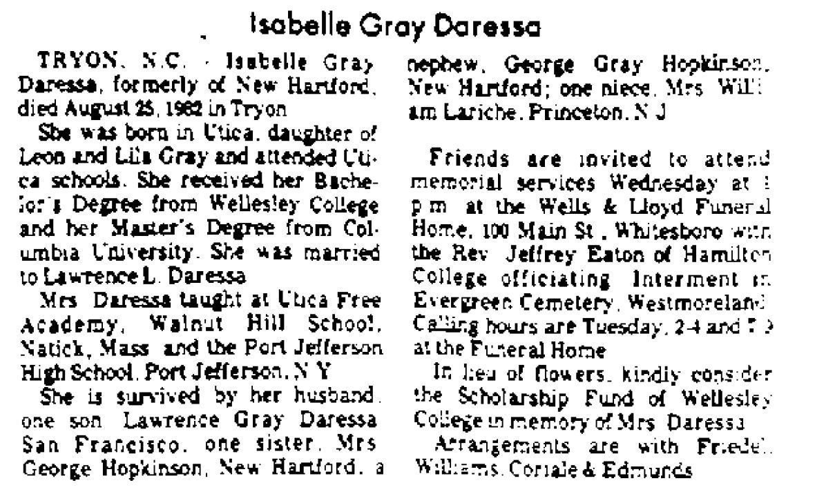 MRS. LAWRENCE DARESSA, 557 Root St. New Hartford, the former Isabel Gray is a sister of Mrs. Hopkinson and Mrs. Leon K. Gray, same address, is her mother. Mr Hopkinson was a cousin of Earl R. Andrews, 50 Scott.