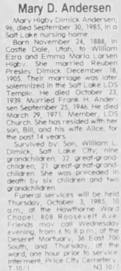 - Mary Ann Higby died on 30 September 1985 in Salt Lake City, Utah, at age 96.2