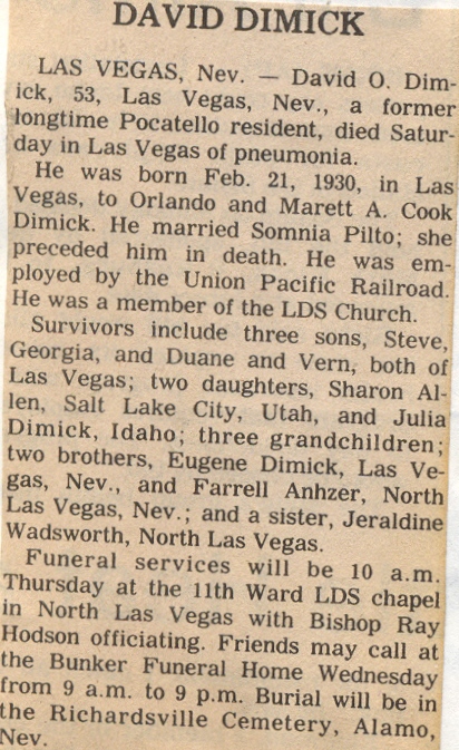 Dave Dimick passed away from heart failure in Gunnison, Utah on July 31, 2014. He was born March 20, 1937 in Lake Shore, Utah to Elwood and Edna Betts Dimick.