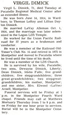 - Virgil Dimick was born on 14 June 1914 in Wardboro, Idaho.1