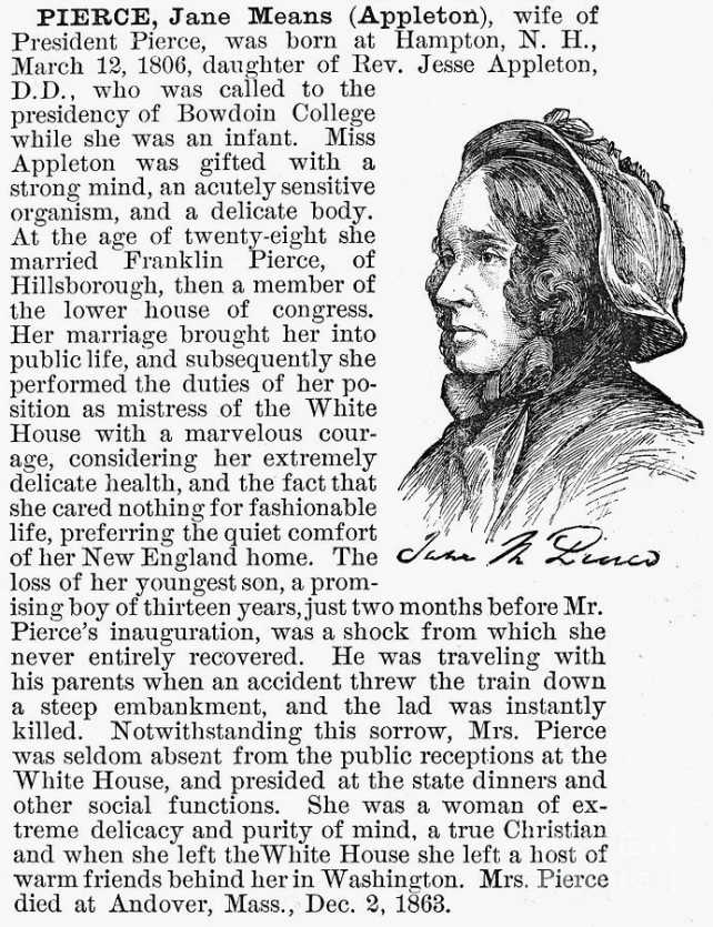 - Jane Means Appleton died on 2 December 1863 in Andover, Massachusetts, at age 57.1