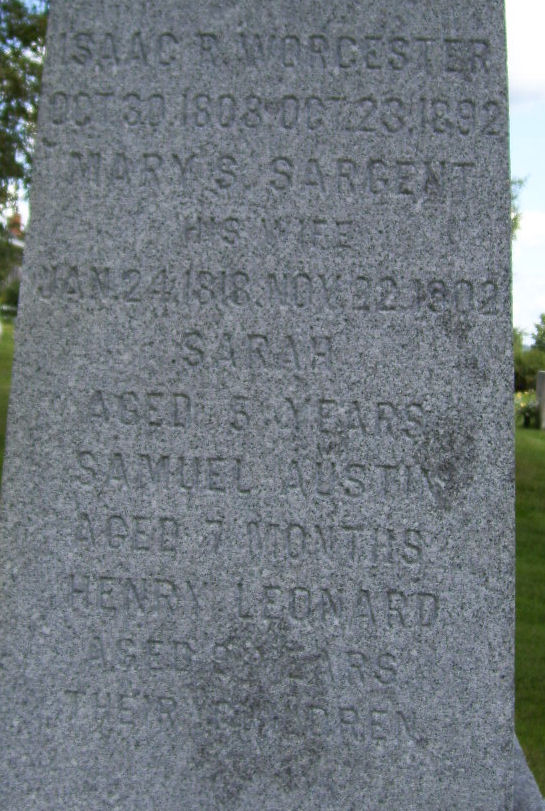 He married Miss Catherine Dean Whitney of Cambridge Mass. April 30, 1849. She was a sister of the wife of his brother, Dr Joseph Sargent, daughter of Asa and Mary (Hammond) Whitney, and a descendant of John Whitney, who came from London to Watertown MA in 1635. "Four months only,: said he, in 1851, "were we allowed to live with each other; at the end of this time she was taken from me, after an illness of ten days, which she contracted while watching anxiously over her mother, who died of the same disease (dysentery) a fortnight previous. Thus from the happiest man living (as I thought), I was made the most unhappy; my home was broken up, and my heart made desolate. I have been a lone man since, though living in the midst of the kindest and best of friends."