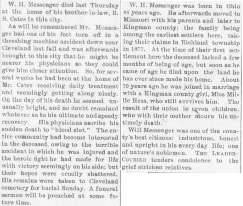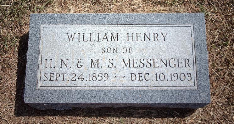 - [S3261] Find A Grave: Cleveland Cemetery, Cleveland, Kansas, William Henry Messenger, created by Linda Endicott, added Sep 2006, memorial number 15711032.