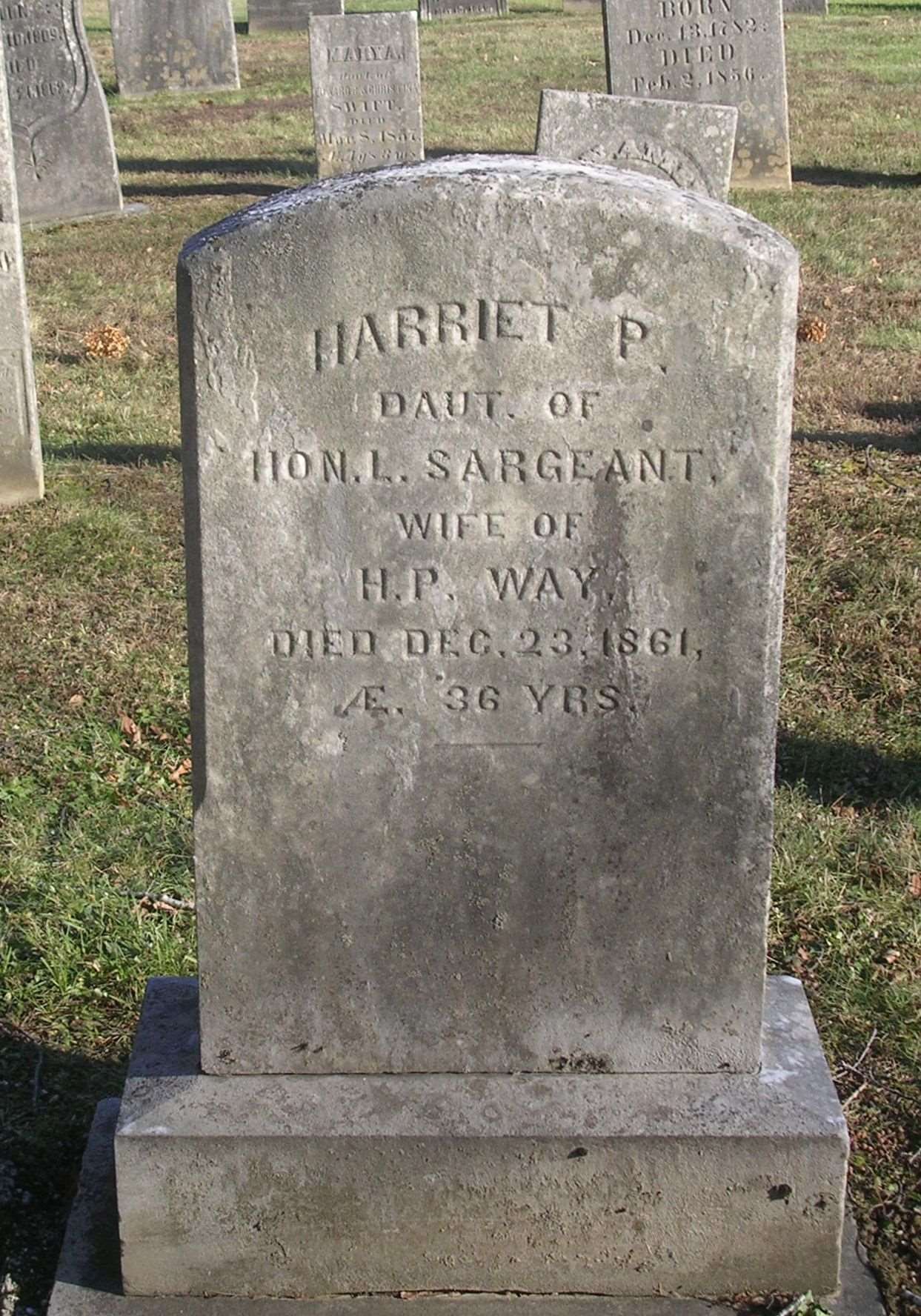 - [S6552] Find A Grave: Dellwood Cemetery, Manchester, Vermont, Harriet Peters Sargeant Way, created by Nancy M Gandy, added Mar 2016, memorial number 159858896.