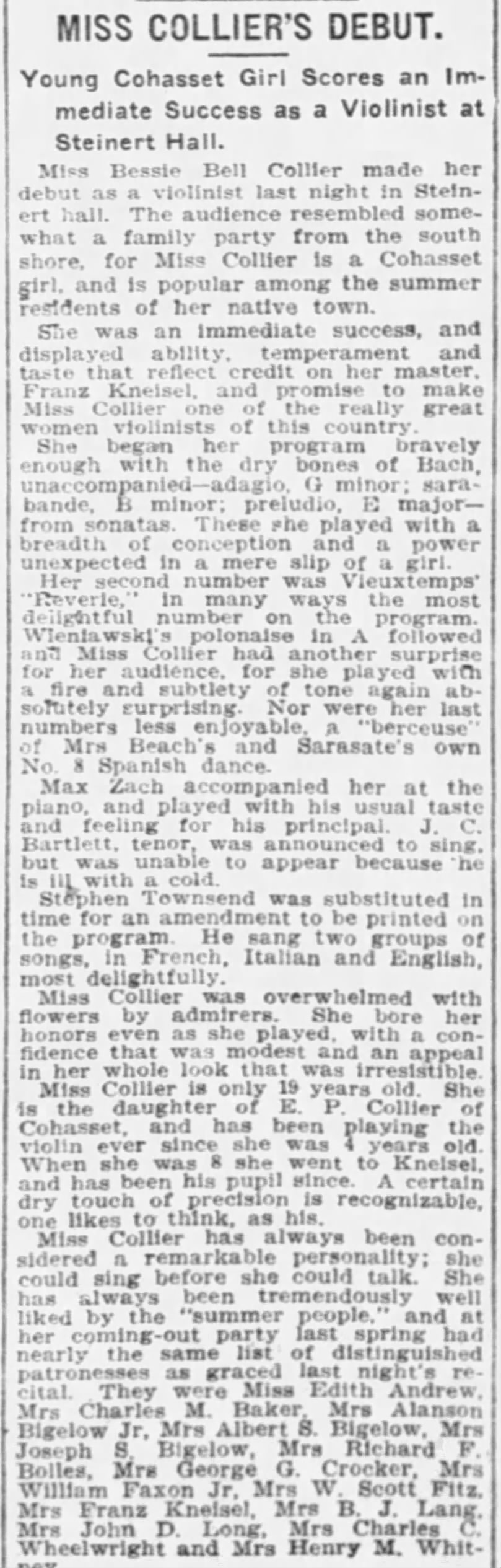 - [S6029] The Boston Globe, Boston, MA, Newspaper, Mrs (Bessie Bell Collier) Ellery obituary notice, published 25 May 1969 p 79.