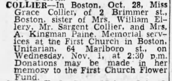 - [S6029] The Boston Globe, Boston, MA, Newspaper, Grace Collier obituary notice, published 30 Oct 1967 p 26.