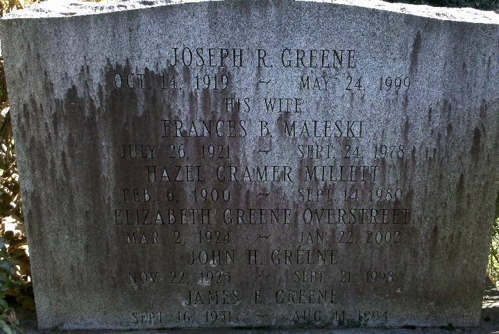 - [S6495] Find A Grave: Green River Cemetery, Greenfield, Massachusetts, James E Greene, created by 10th generation, added Aug 2013, memorial number 114821378.