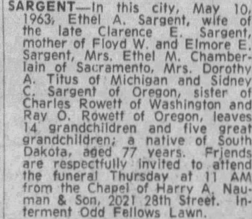 - [S7588] The Sacramento Bee, Sacramento CA, Newspaper, Ethel A Sargent obituary notice, published 12 May 1963, p 33.