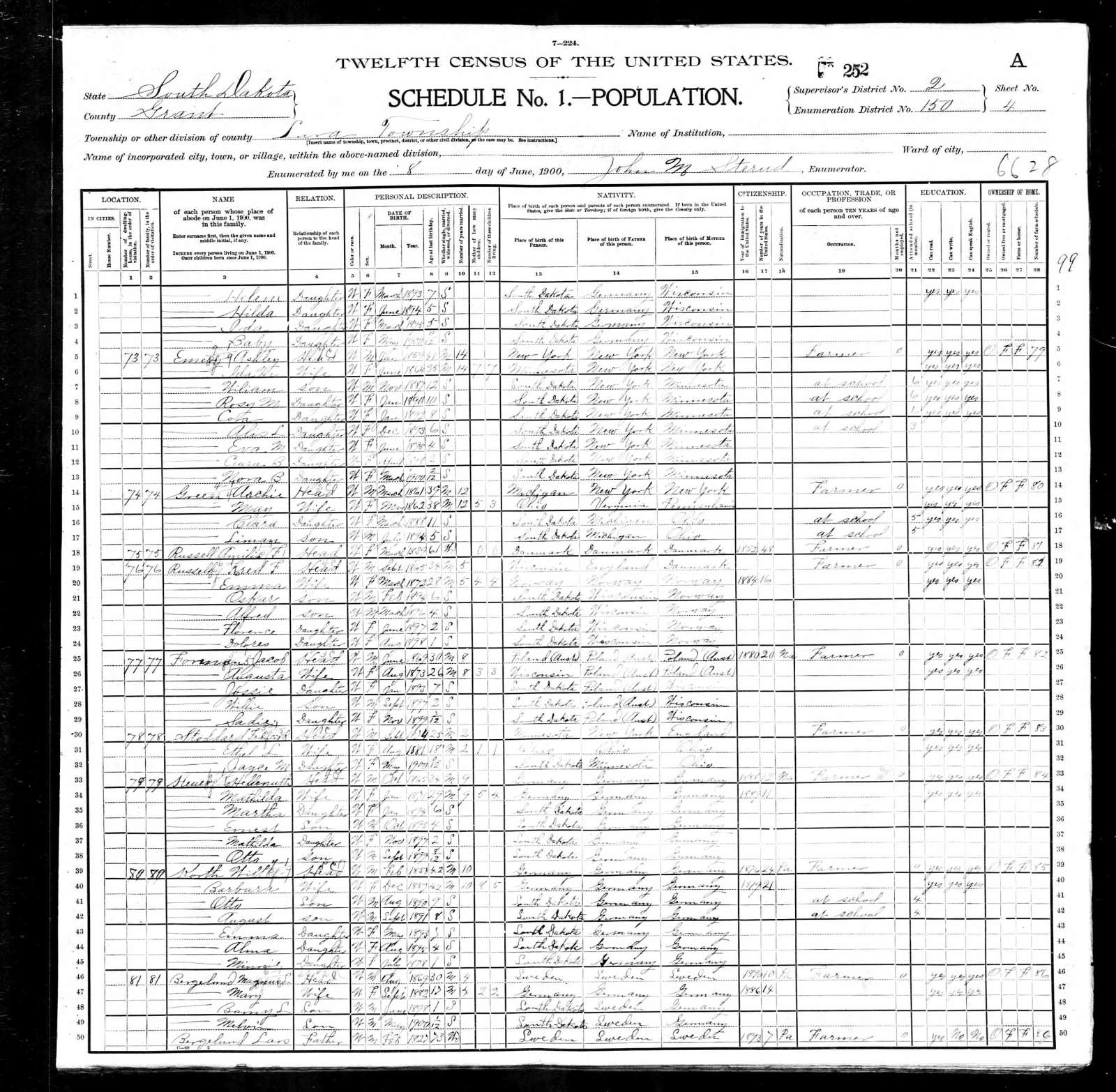- [S2325] 1900 US Federal Census, Lura, Grant County, South Dakota, digital image Ancestry, National Archives micropublication, Francis Stoddard head of household, roll T623_1549, enumeration district 150, page 4A .