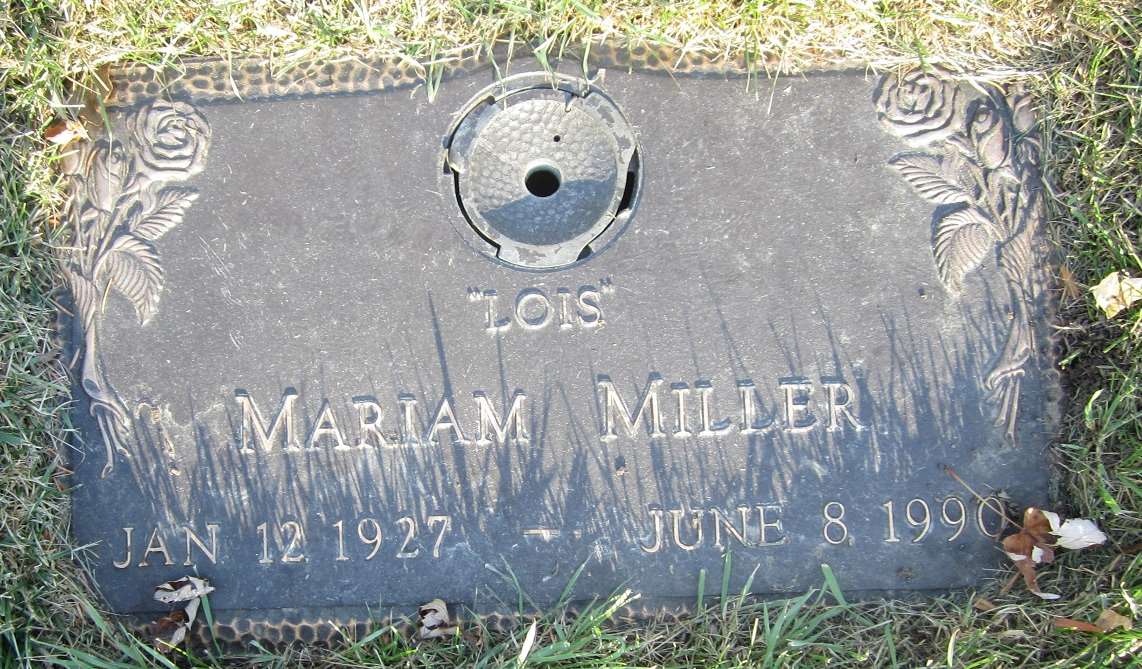 - [S3981] Find A Grave: Forest Lawn Memorial Park, Omaha, Nebraska, Mariam Lois Tuttle Miller, created by Doris Waddell; KDQ, added Jul 2015, memorial number 149574963.