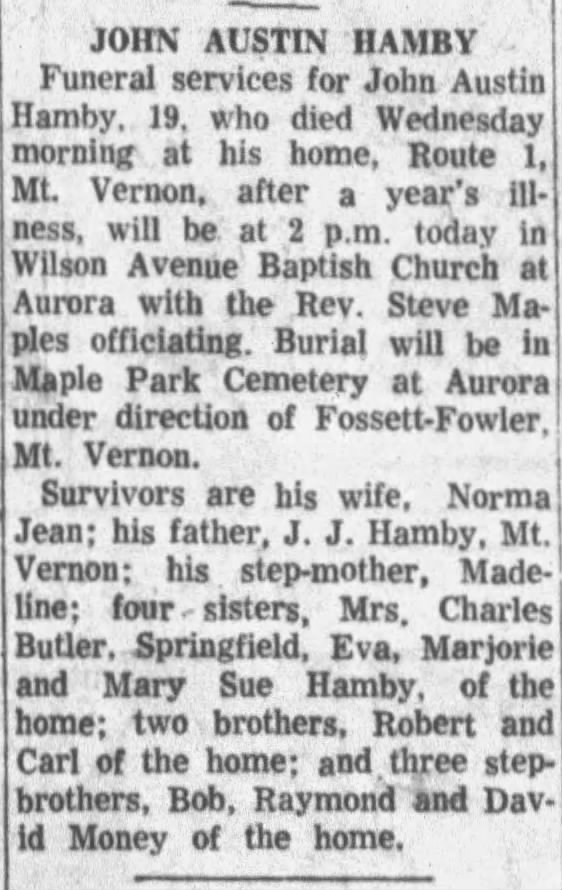 - John Austin Hamby died on 30 October 1957 in Mount Vernon, Missouri, at age 19.2