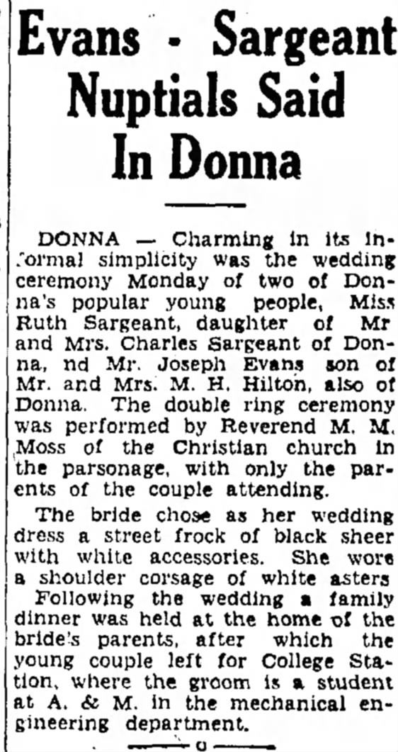 - [S9338] The Brownsville Herald, Brownsville TX, Newspaper, wedding notice Evans & Sargeant, published 7 Sep 1938 p 5.