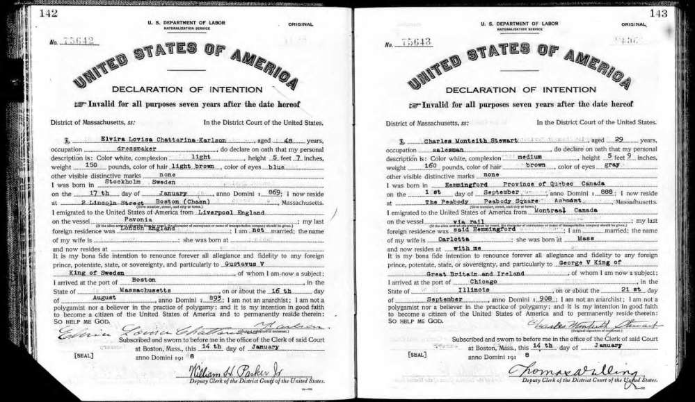 - [S6815] Massachusetts, US, State and Federal Naturalization Records, 1798-1950, online image database, digitized by ancestry.com Operations Inc, 2011, www.ancestry.com collection 2361. (Original publication: Petitions and Records of Naturalization, National Archives at Boston, Waltham, MA,) naturalization records Charles Monteith Stewart, naturalization record, nbr 75643.