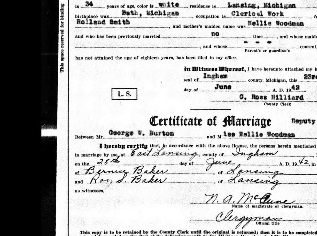 - The clerk made a mistake in typing out the Certificate of Marriage - saying the marriage was between George W Burton and Miss Nellie Woodman (Genevieve's mother!)5