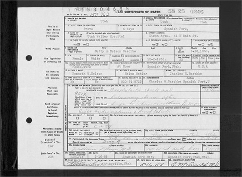 - [S4866] Betty A Nelson Baschke, Death Certificate, 58 25 0246.