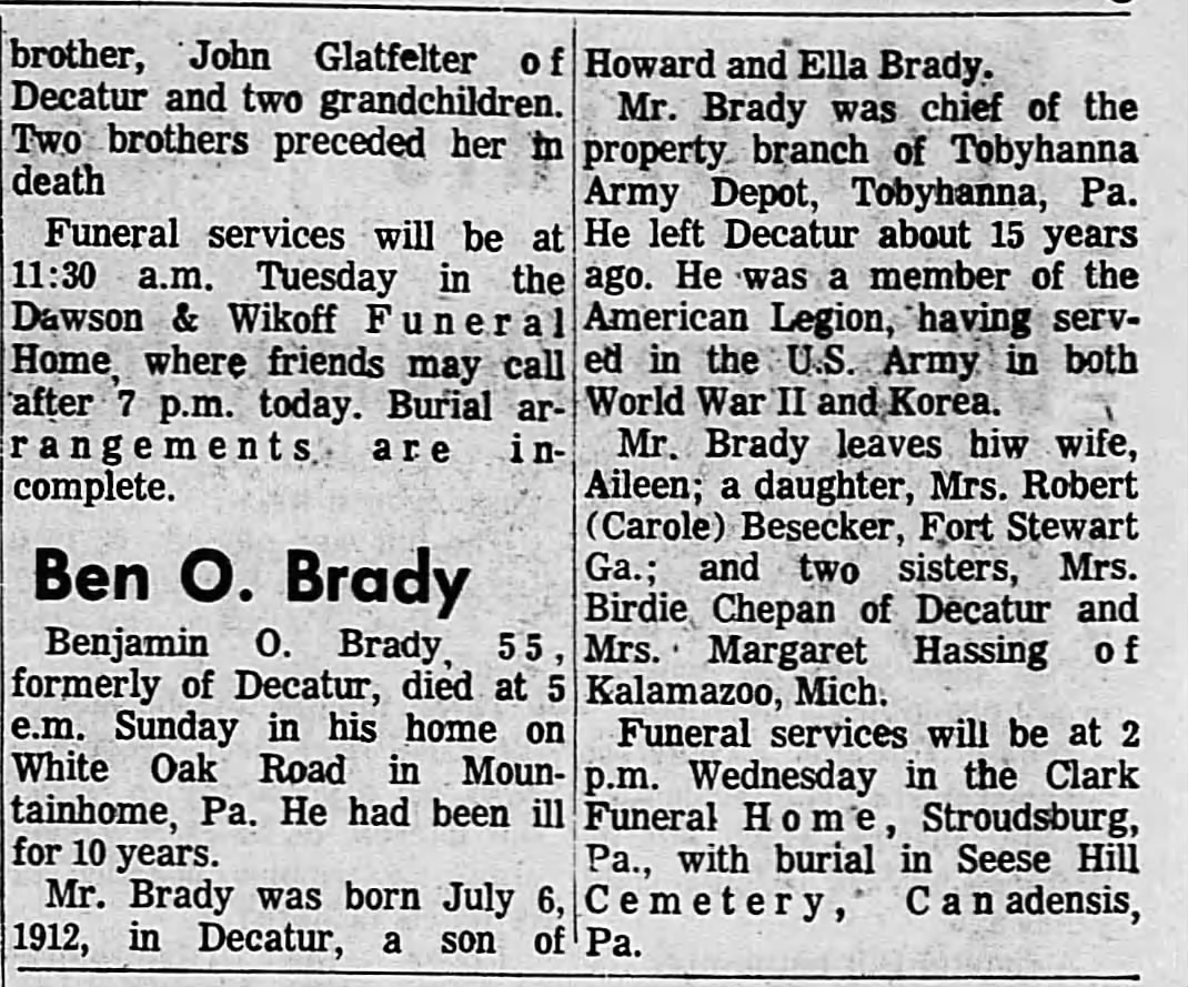 Vera B., wife of Raymond Koch, died Tuesday morning at 11:30 o'clock in the home of her parents, Mr. and Mrs. Howard Brady, five miles southwest of Decatur after a prolonged illness. Vern Brady was born May 11, 1902 at Monticello and came to Decatur with her parents when she was a small child.