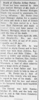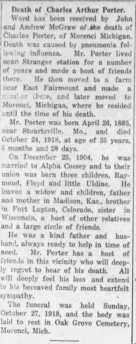 - [S4333] The Tonganoxie Mirror, Tonganoxie, Kansas, Newspaper, Charles Arthur Porter, obituary notice, published 16 Jan 1919.