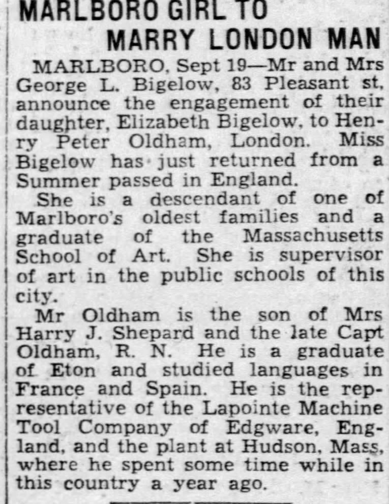 - [S6029] The Boston Globe, Boston, MA, Newspaper, Oldham_Bigelow engagement notice, published in the Boston Globe 19 Sep 1936, p 15.