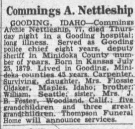 - In 1920 Commings Archibald Nettleship was the police chief in Gooding ID, also a carpenter.7,1