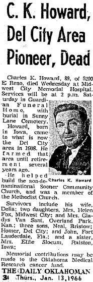 - [S4706] 1920 US Federal Census, Boone, Oklahoma County, Oklahoma, digital image Ancestry, National Archives micropublication, Chas K Howard head of household, roll T625_1473, enumeration district 96, page 1A .