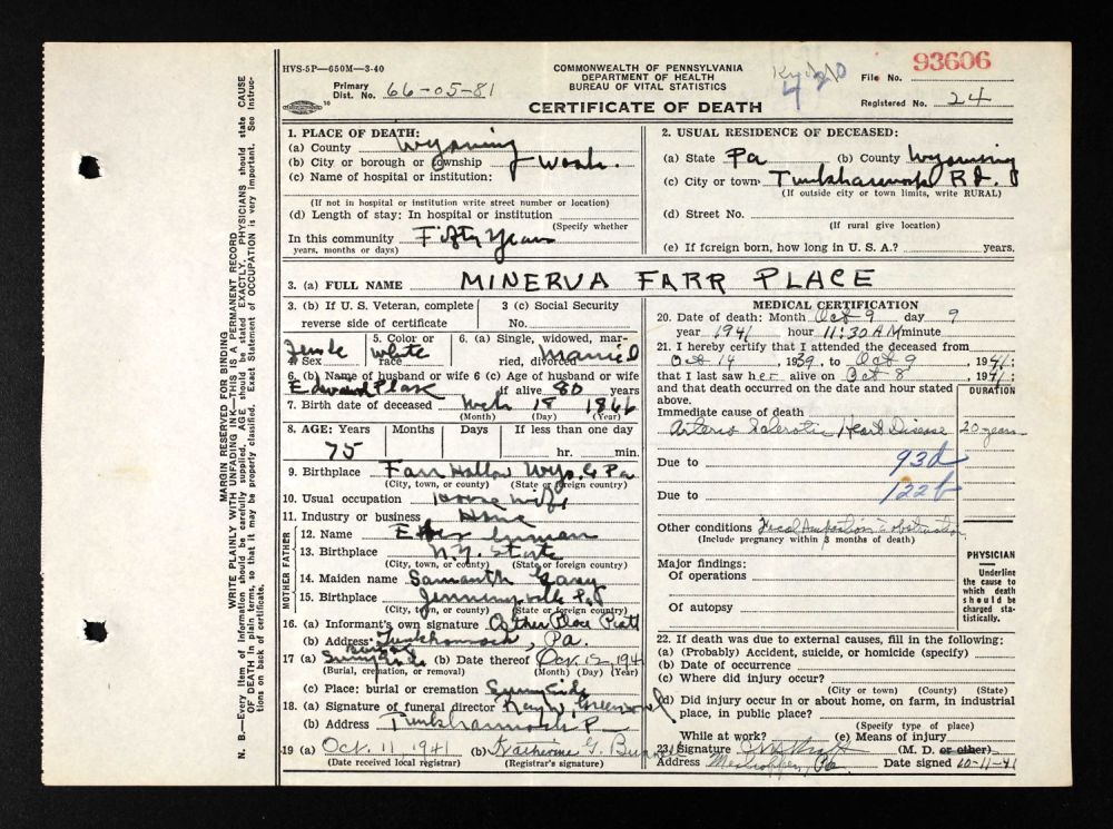 - She died on 2 September 1941 in Wyoming County, Pennsylvania, at age 68.2