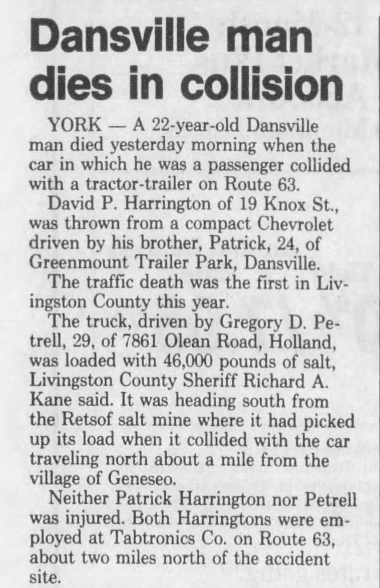 David P. Harrington, 22, of 19 Knox St., Dansville, died Monday (Feb. 8, 1988) as the result of injuries received in a motor vehicle accident in York.