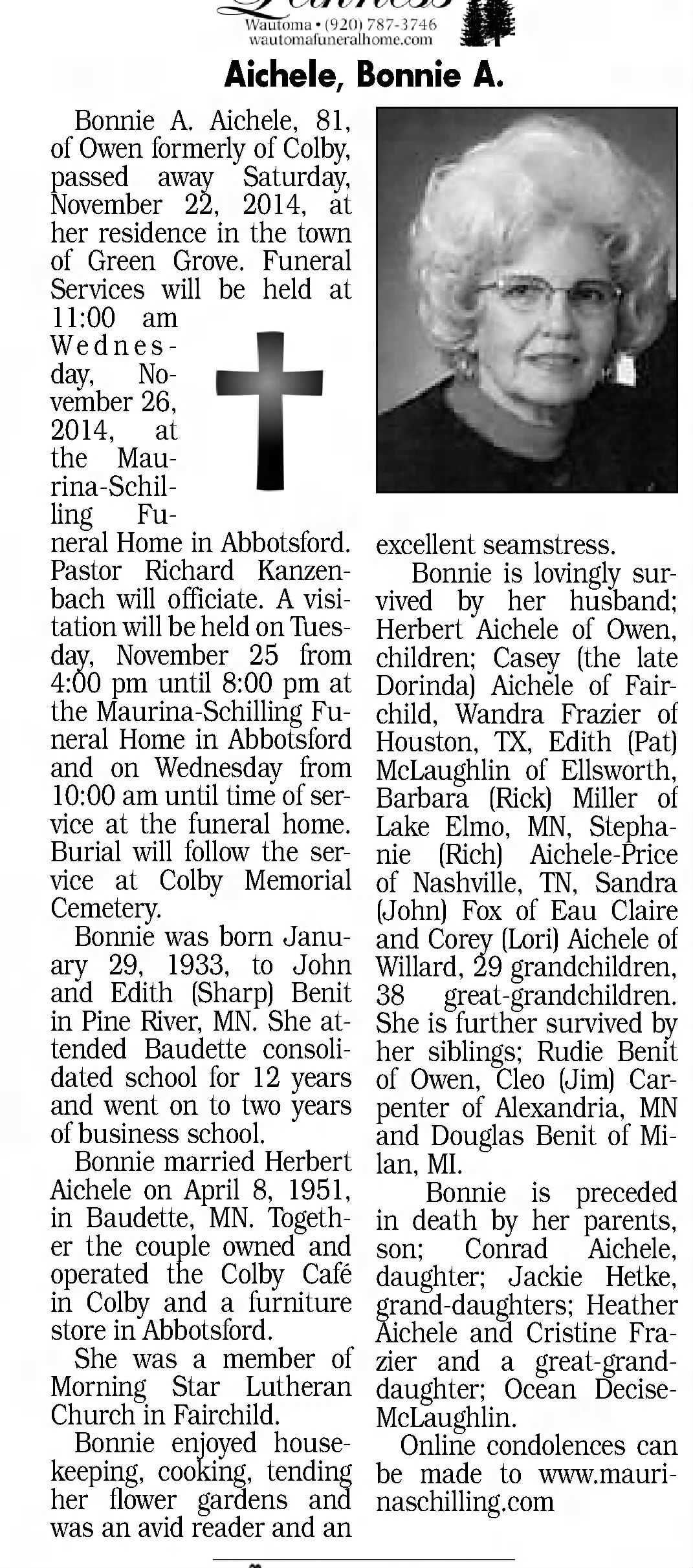 - [S5826] Marshfield News-Herald, Marshfield, WI, Newspaper, Bonnie A Aichele obituary notice, published 24 Nov 2014 p A2.