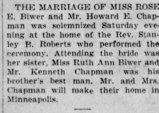 - [S57] Star Tribune, Minneapolis, Minnesota, Newspaper, Chapman-Biwer wedding announcement, published 28 May 1929, p 8.