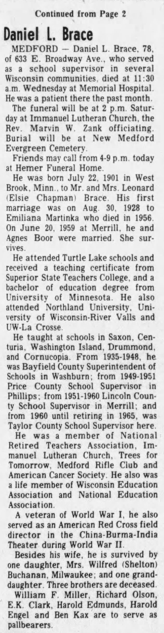 - [S5826] Marshfield News-Herald, Marshfield, WI, Newspaper, Daniel L Brace, obituary notice, published 25 Jan 1980 p12.