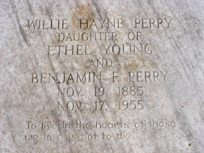 - [S4288] Find A Grave: Young-Thackston-Perry Cemetery, Canterbury, South Carolina, Willie Hayne Perry, created by Chris Smith, added Aug 2009, memorial number 41044750.