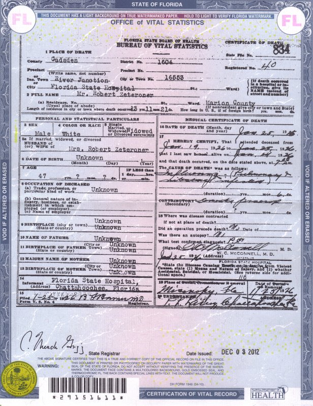 - John Robert Zetrouer died on 26 January 1926 in Chattahoochee, Florida, at age 52.1,2