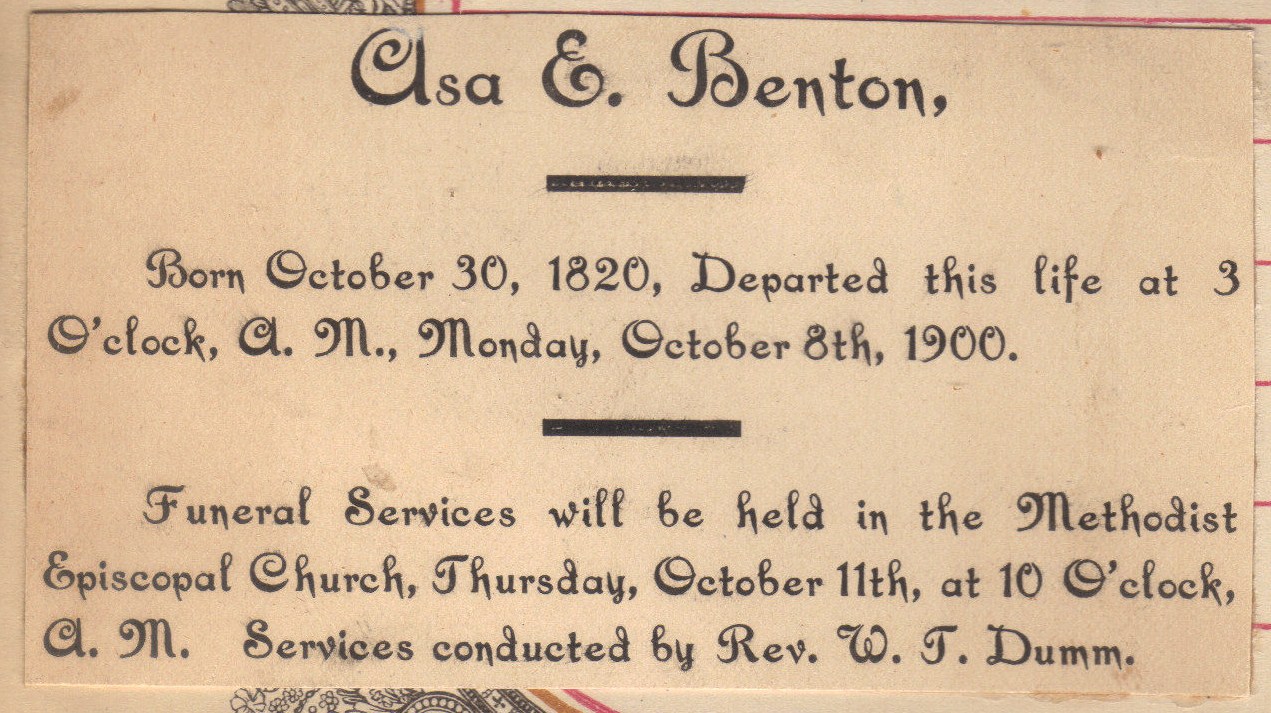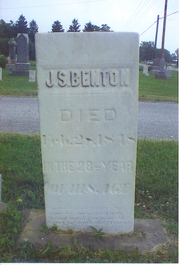 - [S3946] Find A Grave: Chestnut Grove Cemetery, Sandusky County, Ohio, Asa Ervin Benton, created by dhintx, added Sep 2010, memorial number 59309059.