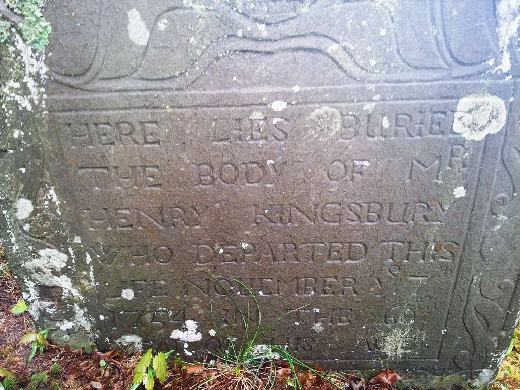 - He was buried in Salisbury Point Burying Ground, Amesbury, Massachusetts. 'Here lies buried the body of Mr Henry Kingsbury Who departed this life November Ye yth 1754 in the 60th Year of His Age' Inscription on gravestone, originally in Old Burying Hill, Newburyport. The remains and graves were removed to Salisbury Point Burying Ground by his great-great-grandson Henry Kingsbury.3,4