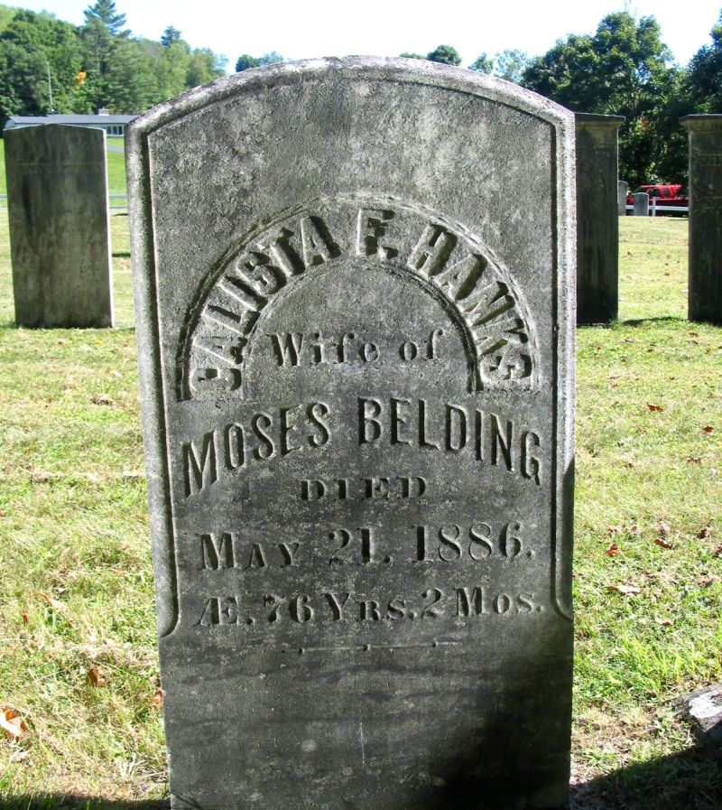- [S5210] Find A Grave: Maple Street Cemetery, Hardwick, Vermont, Calista F Hanks Belding, created by David Edsall, added Jul 2012, memorial number 94448629.