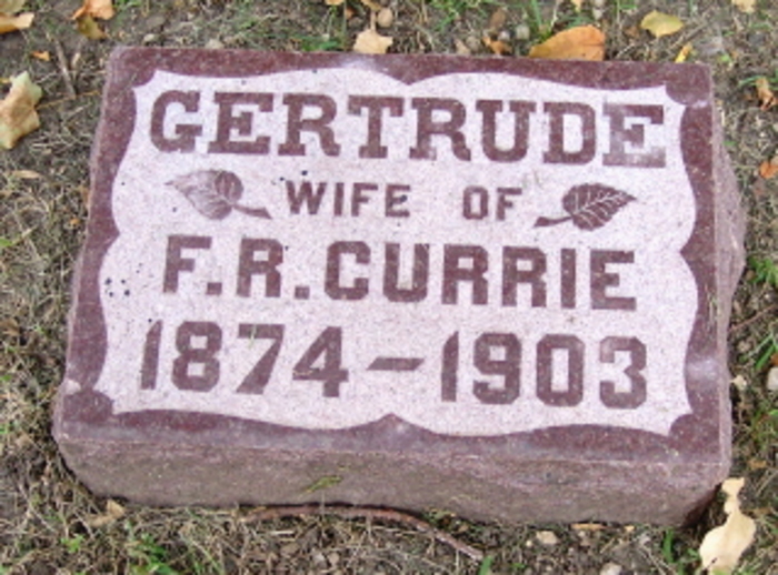 - [S4112] Find A Grave: Elmwood Saint Joseph Cemetery, Mason City, Iowa, Gertrude E Irwin Currie created by Gwen Miller, added Sep 2008, memorial number 29683743.