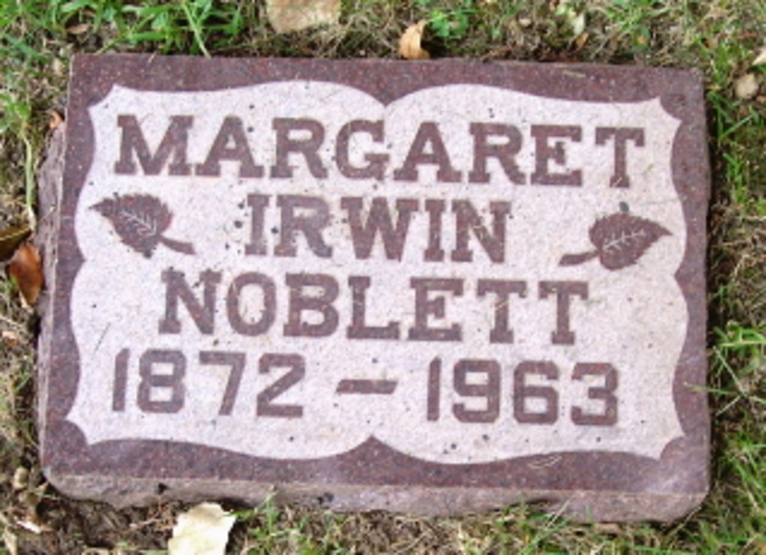 - [S4112] Find A Grave: Elmwood Saint Joseph Cemetery, Mason City, Iowa, Margaret Irwin Noblett, created by Gwen Miller, added Sep 2008, memorial number 29683704.