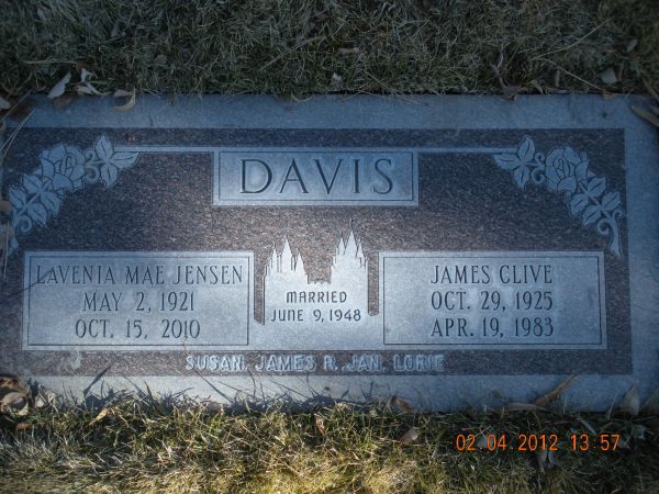 Lavenia Mae Jensen Davis was born May 2, 1921 in Montpelier, Idaho to Jacob C. and Vinnie Humpherys Jensen. She attended schools in Montpelier, College at Utah State University in Logan, Utah, and Brigham Young University in Provo, Utah. She graduated with a Bachelors Degree in Education.