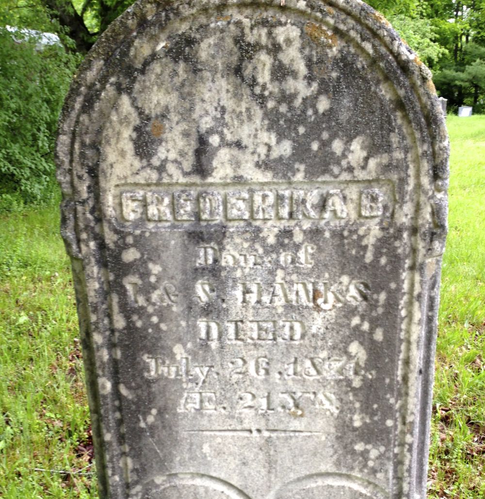 - [S5036] Find A Grave: Lakeville Baptist Church Cemetery, Cossayuna, New York, Frederika G Hanks, created by Caroline Hoag, added Jul 2013, memorial number113293202.